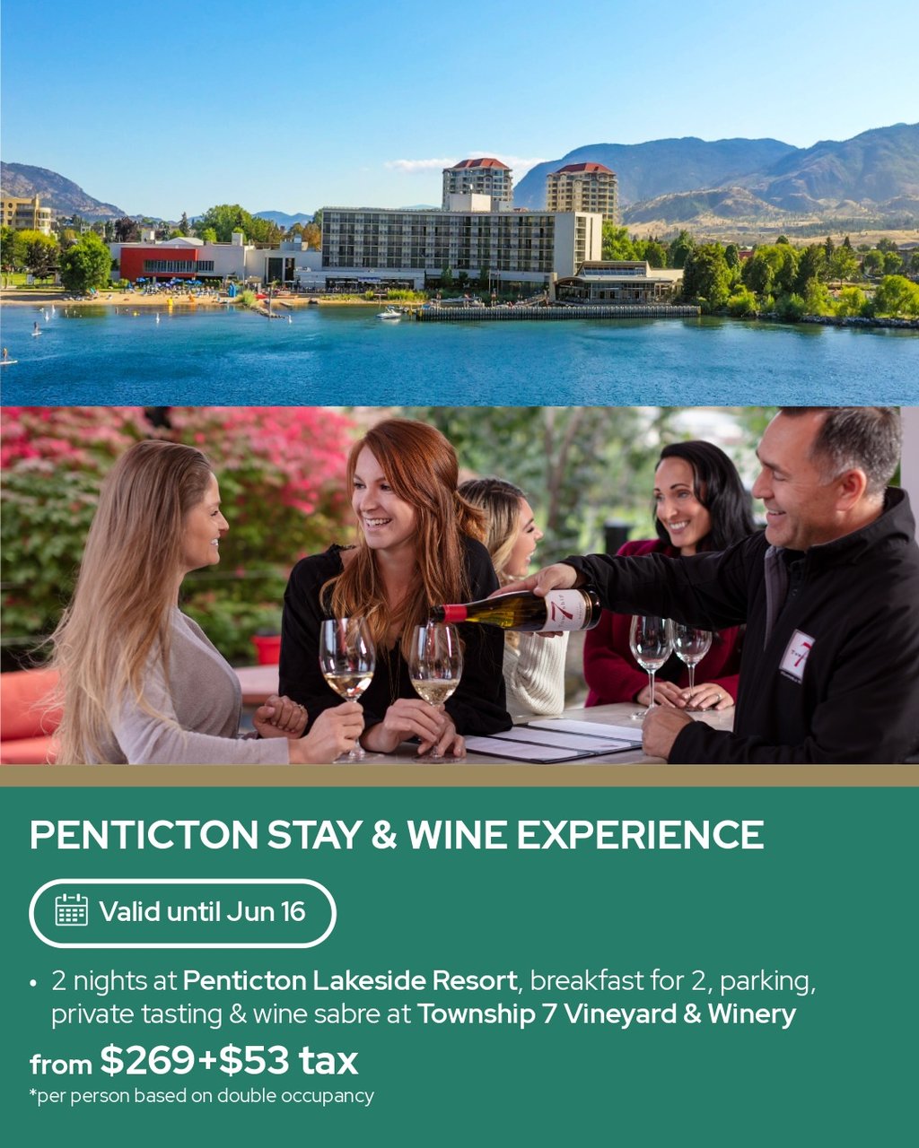 2 nights at Penticton Lakeside Resort, One breakfast for 2 voucher, parking, tasting & wine sabre at Township 7 Vineyard